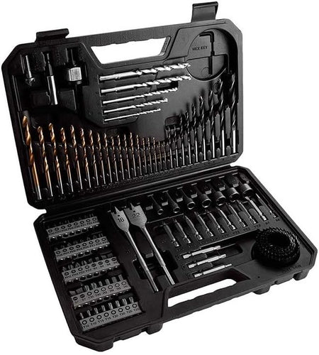 19 x metal drill bits (2 x 1.5, 3 x 2, 1 x 2.5, 4 x 3, 1 x 3.2, 1 x 3.5, 1 x 4, 1 x 4.5, 1 x 4.8, 1 x 5, 1 x 5.5, 1 x 6 and 1 x 7mm), 40 x 25mm screwdriver bits (10 x PH (2 x 0, 2 x 1, 3 x 2 and 3 x 3mm), 10 x PZ (2 x 0, 2 x 1, 3 x 2 and 3 x 3mm), 6 x S (2 x 4, 2 x 6 and 2 x 7mm), 10 x T (2 x 10, 2 x 15, 2 x 20, 2 x 25, 30 and 40mm), 4 x H (3, 4, 5 and 6mm)), 13 x 50mm screwdriver bits (4 x PH (0, 1, 2 and 3mm), 4 x PZ (0, 1, 2 and 3mm), 2 x S (4 and 6mm), 3 x T (10, 20 and 25mm)), 2 x spade bits (16 and 22mm), 5 x masonry drill bits (4, 5, 6, 8 and 10mm), bit holder, 4 x holesaws (32, 38, 44 and 54mm), hole saw adapter, 9 x wood drill bits (2 x 3, 2 x 4, 1 x 5, 1 x 6, 1 x 7, 1 x 8 and 1 x 10mm), 7 x nut setters (5, 6, 8, 10, 11, 12 and 13mm), countersink and Allen key.