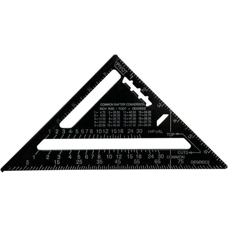 Ideal for use as a saw guide and has an extra-thick aluminum body for heavy duty use as well as stamped-in contrasting color graduations for better readability. It also features a large base to provide grip on materials. 90° angle scale with 1° graduations for easy measuring of angles. Scales of top cuts of common jack rafters, hip and valley rafters for versatility. Pivot point makes marking out angles easy.