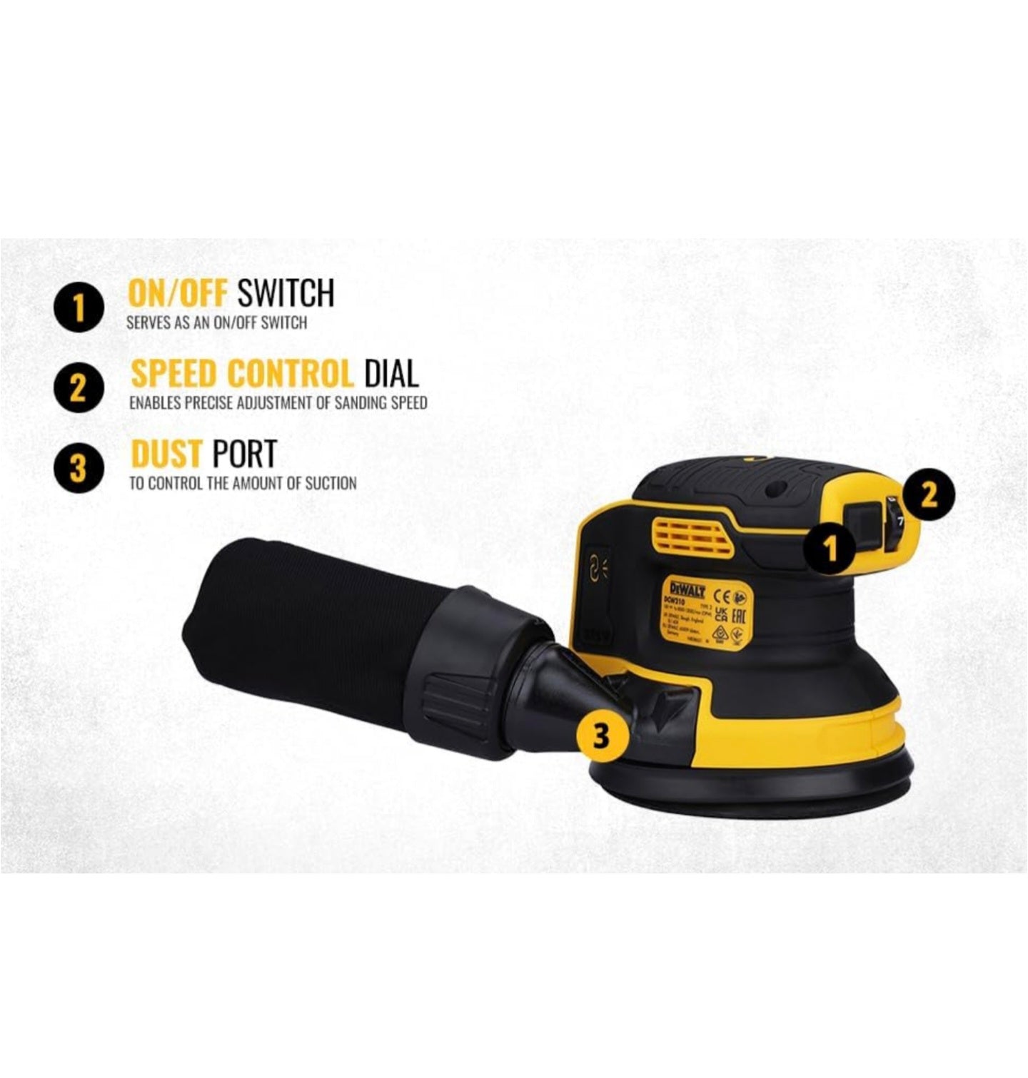 An easy-to-reach speed control dial for quick one-handed speed adjustments, a dual sealed switch that helps to prevent dust ingress, and a replaceable 8-hole hook & loop sanding pad for quick and easy paper changing, and a one-handed locking dust bag featuring an AirLock™ connection.
