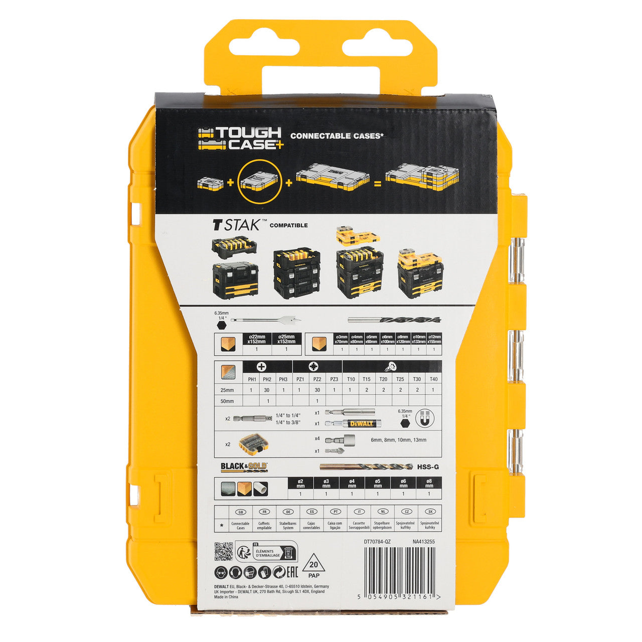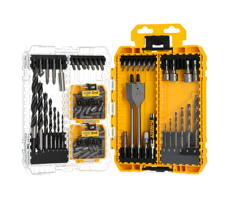 The Dewalt DT70784 is a 100 Piece Set of various Drills and Bits with 6 x DEWALT Black Gold HSS Drill Bits. They have a speed tip and a tough core for increased durability. The bits also incorporate a no spin shank that eliminates the frustration of the bit spinning in the chuck. Supplied in a TOUGH CASE+, this is part of a connectable case system that is TSTAK compatible. Individual TOUGH CASES can be clipped together for easy transportation.