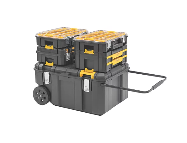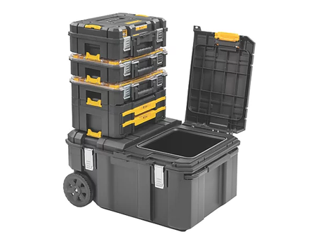 Set consisting of a rolling TSTAK tool chest, a shallow box, 2-drawer unit and 2 organisers. Storage comes with an IP54-rated water and dust seal, heavy duty metal hinges and latches. All components are TSTAK compatable.