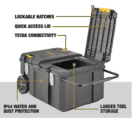Offers large volume tool storage of up to 30 gallons. Features IP54 seals on both large and quick-access lids to protect contents from water and dust. Quick-access lid offers access to tools inside chest without removing boxes placed on top. Offers convenient workstation and accessibility with TSTAK module connectivity using durable side latches.