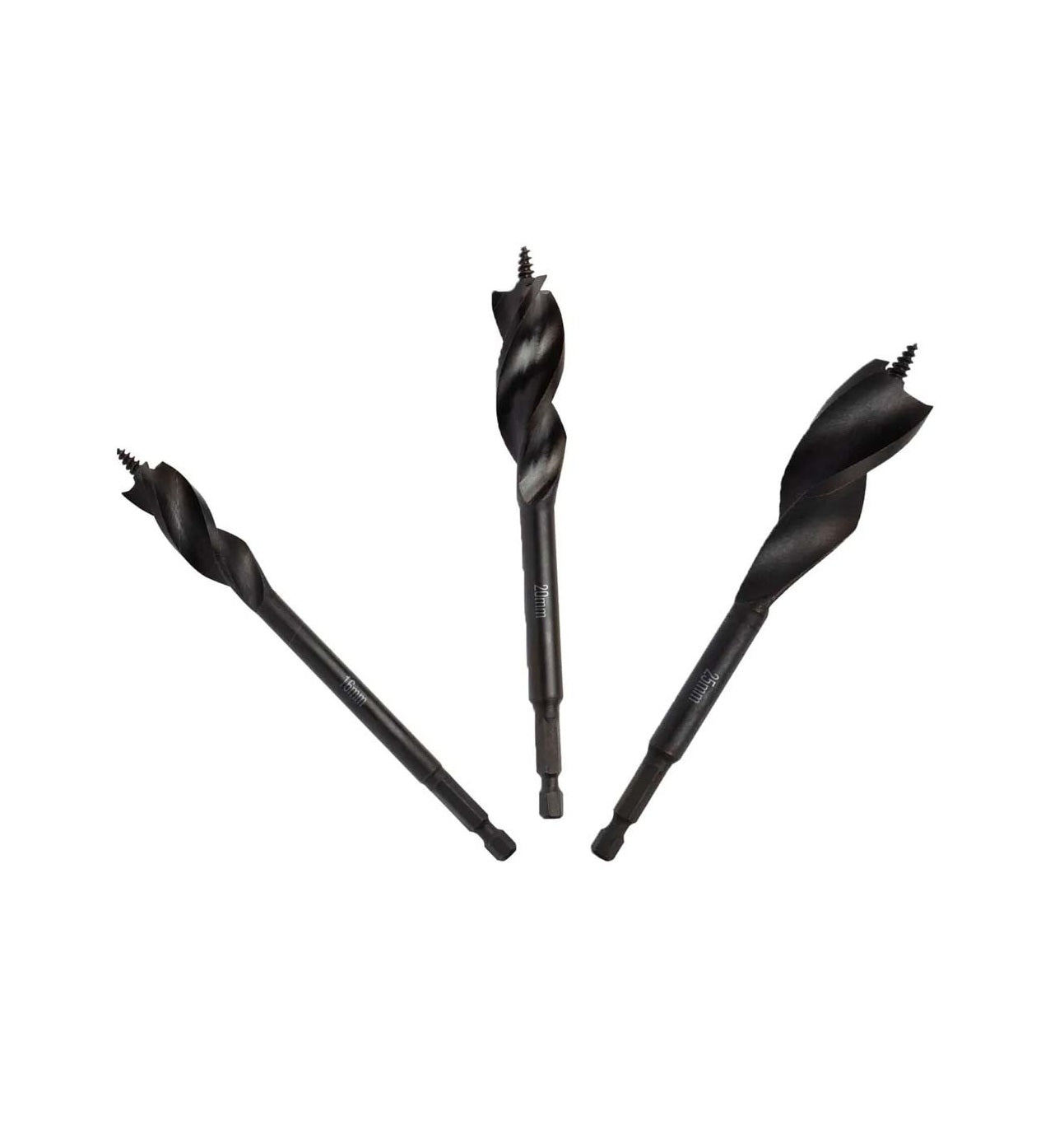 Each drill bit, 16mm, 20mm, 25mm x 150mm, has three cutting edges that allow for up to six times faster cutting action compared to standard flat bits..  This, along with the tri-flute design, delivers impressive and optimal cutting action along with impressive chip removal.