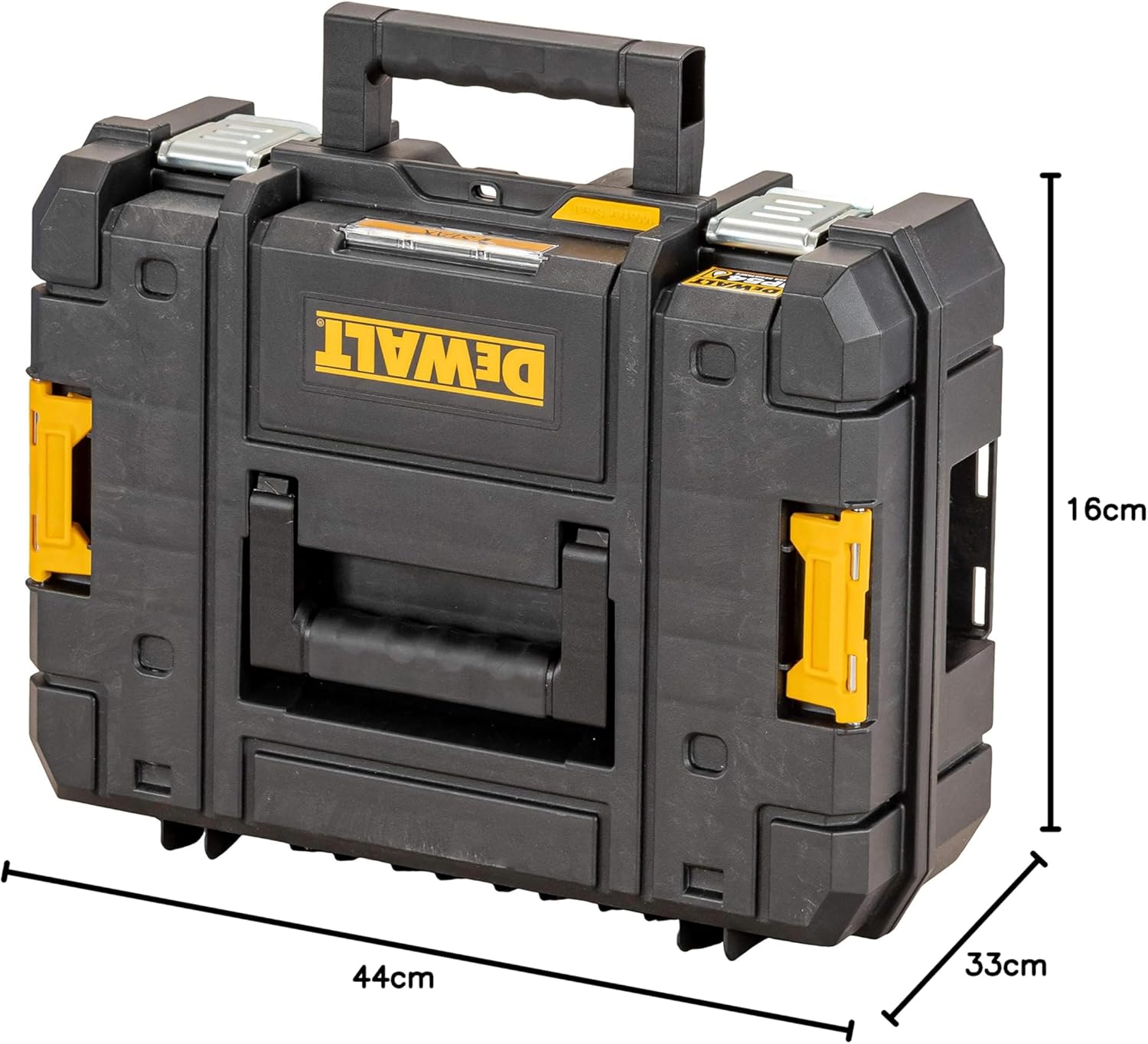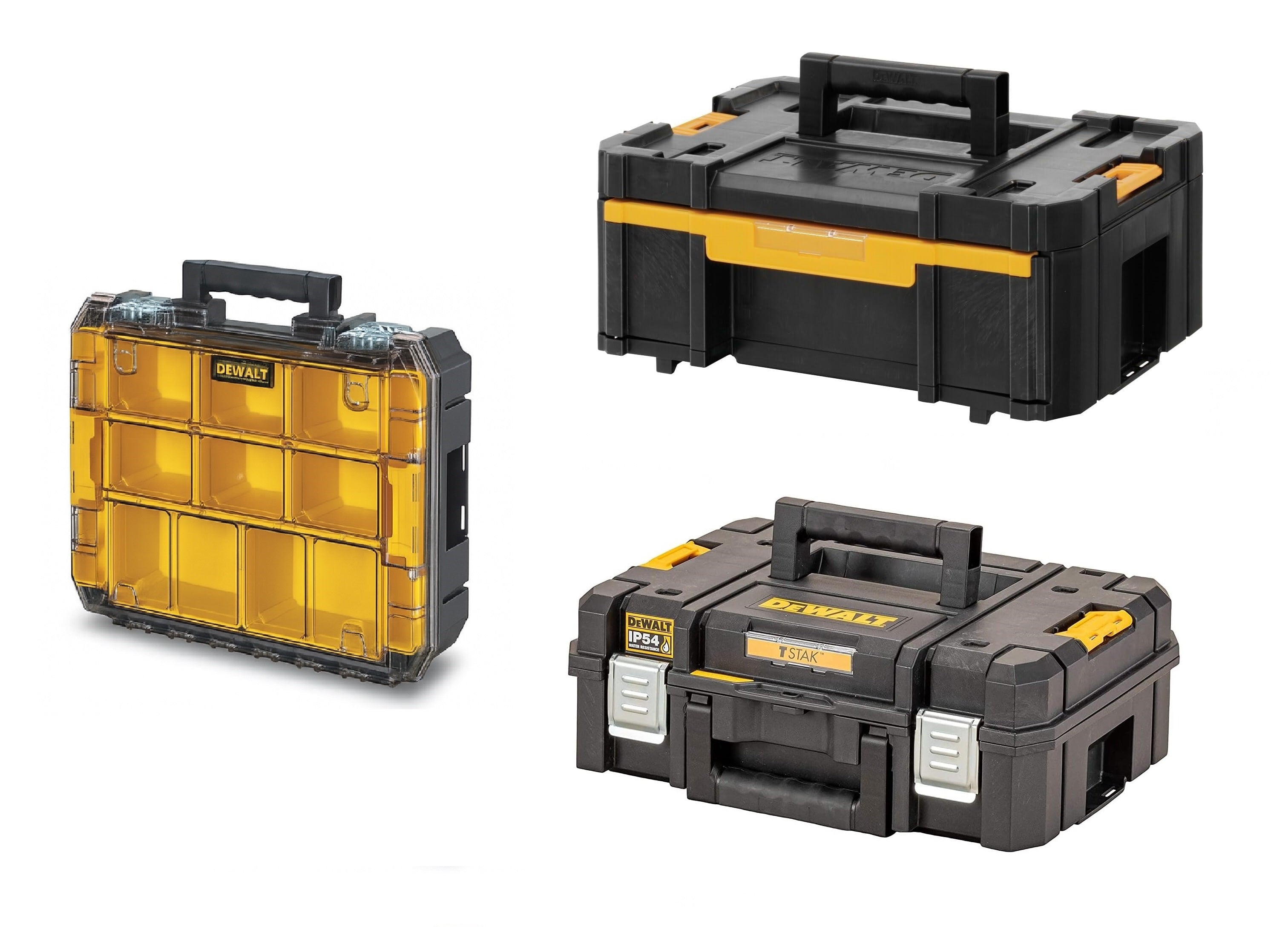 upgraded TSTAK 2.0 range. Robust metal latches capable of dealing with the demands of any jobsite. The IP54 rating provides protection against water and dust entering the box. Features built-in fixing point for the DEWALT tracker (not supplied).