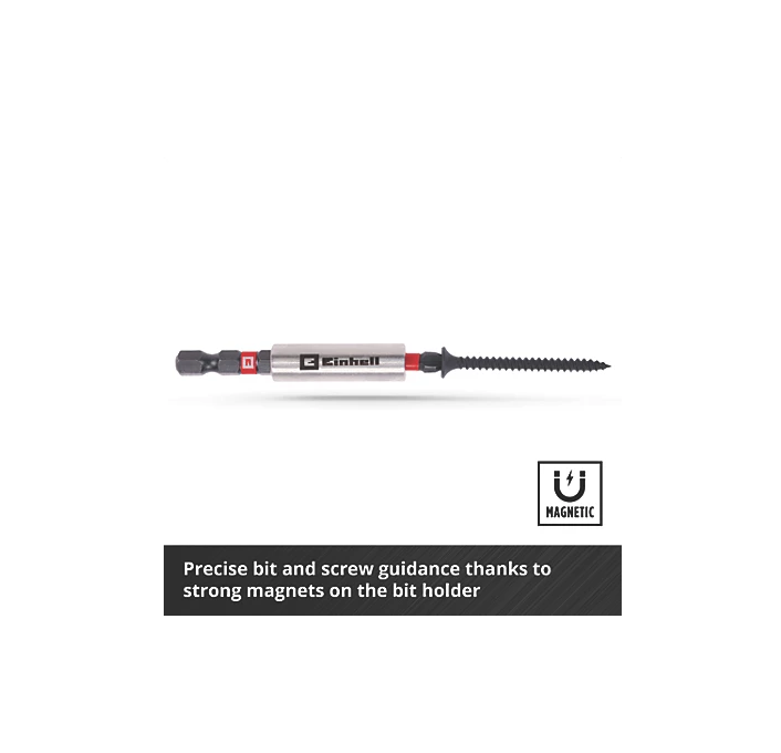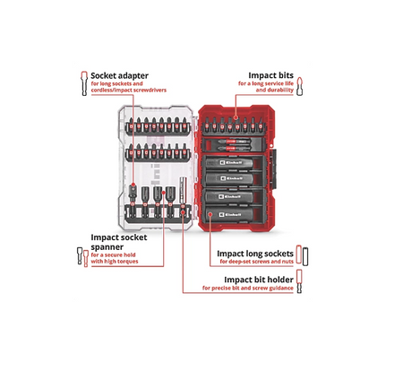 Einhell M-Case 35-piece impact bit set, suitable for use with standard drill chucks and bit holders in impact cordless screwdrivers and drills. Contains 24 x 25 mm impact-resistant bits with C 6.3 shanks and 2 x 50 mm bits with E 6.3 shanks. Made from manganese-phosphatised S2 steel for durability and protection against corrosion. Includes 3 x magnetic hex sockets with E 6.3 shanks in 6, 8 and 10 mm, as well as 4 x long sockets with a 3/8" square receptacles in spanner widths of 10, 12, 13 and 14mm. Made from durable manganese-phosphatised 50BV30 steel to withstand high torques in impact cordless screwdrivers. Ideal for use in the automotive industry, in mechanical engineering and repairing household appliances. Supplied with 3/8" square socket adapter to E 6.3, allowing long sockets to be used with cordless and small impact screwdrivers. Features 60 mm bit holder with E 6.3 carbon steel shank, stainless steel sleeve and strong magnet.