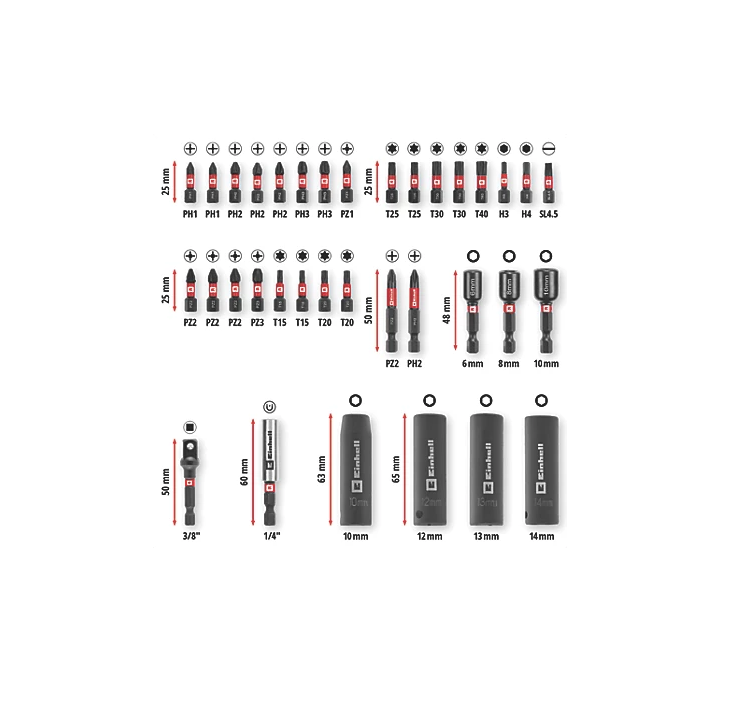 24 x 25mm bits (2 x PH1, 3 x PH2, 2 x PH3, PZ1, 3 x PZ2, PZ3, 2 x T15, 2 x T20, 2 x T25, 2 x T30, T40, SL4.5, H3 and H4), 2 x 50mm bits (PH2 and PZ2), 4 x long sockets (10, 12, 13 and 14mm), 3 x hexagon sockets (6, 8 and 10mm), 3/8" square socket adapter to E 6.3, impact-resistant bit holder (60mm), and storage box (17.5 x 10.8 x 4.5cm).