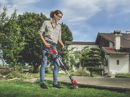 Cordless grass trimmer that makes light work of tidying up lawn edges or small patches of grass where mowers find it hard to reach. Adjustable handle ensures a comfortable working position. Features a flower guard that provides effective protection for flowers and plants. Also includes a trimmer head that can be angled from +/- 90° enabling low lying hedges to be trimmed with ease. Supplied with 20 plastic cutting blades. Quick and easy blade change. Requires 1 x 18V Einhell Power X-Change rechargeable battery.