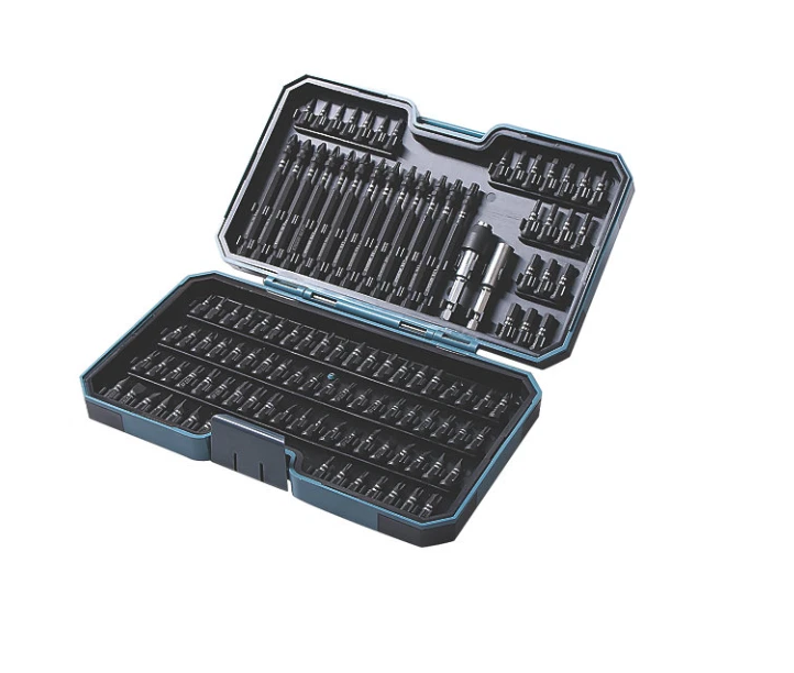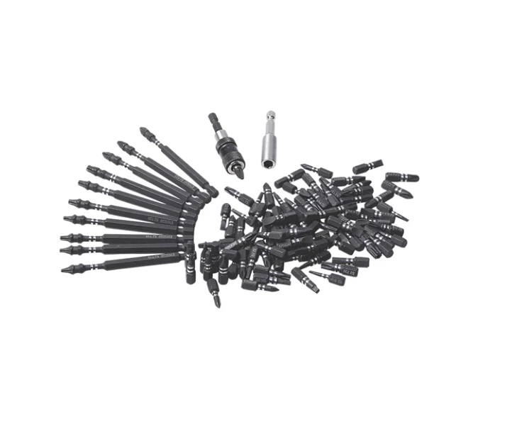 98 x 25mm screwdriver bits (16 x Phillips (4 x PH0, PH1, PH2 and PH3), (18 x slotted (3 x SL3, SL4, SL5, SL5.5, SL6 and SL6.5), (12 x PZ (3 x PZ0, PZ1, PZ2 and PZ3), (12 x Hex (3 x H3, H4, H5 and H6), (12 x Square (3 x SQ0, SQ1, SQ2 and SQ3), (21 x TX (3 x T10, T15, T20, T25, T27, T30 and T40), (7 x TS (1 x TS10, TS15, TS20, TS25, TS27, TS30 and TS40)), 13 x 90mm screwdriver bits (3 x Phillips (PH2)), (3 x PZ ( PZ2)), (7 x TX (2 x T10 and T15)), (1 x T20, T25 and T30), 1 x bit holder and 1 x quick change chuck.