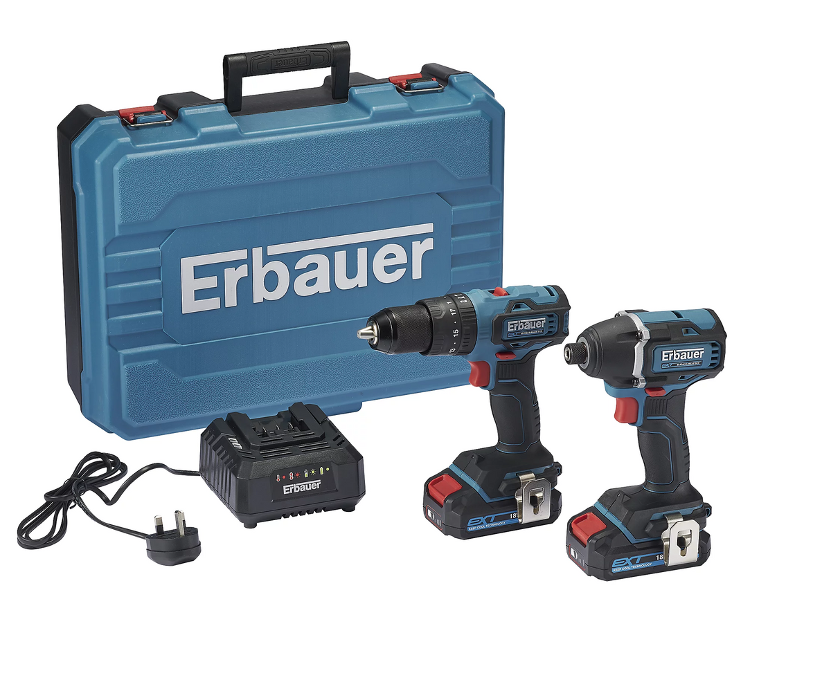 Includes impact driver, combi drill, charger and 2 x 2.0Ah 18V batteries. Tools compatible with all Erbauer EXT 18V batteries. Supplied with carry case