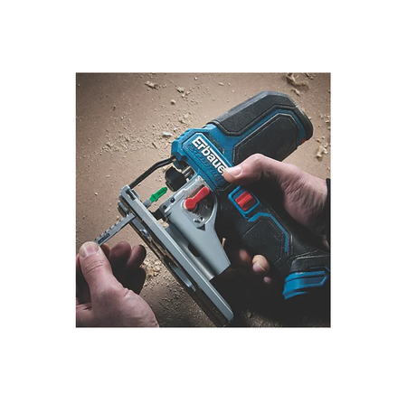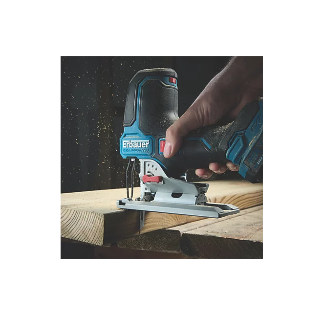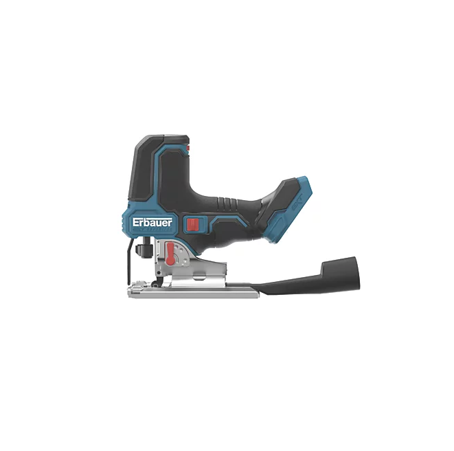 Erbauer ERI1088JSW 18V barrel jigsaw featuring V2 brushless motor to deliver intricate cuts in tight spaces, under cabinets or between beams, and an aluminium shoe to provide a stable base for precision. Powerful and compact. 4-stage orbital action allows customisation for different materials and cutting tasks, and auto-mode adjusts speed and blade movement for optimal results. Also features 5-setting variable speed dial and dust blower to improve cutting accuracy and keep the workspace clean. Includes integrated LED worklight to illuminate the cutting line, one-hand quick blade change system for uninterrupted work, and slim, ergonomic handle for comfort and control.