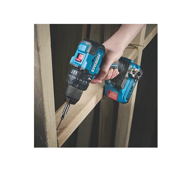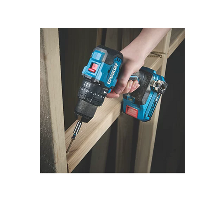 Erbauer EXT 18V compact combi drill and impact driver set. Contains ERI1092COM and ERI1093IPD, featuring V2 brushless motors and delivering up to 35% more power, 25% faster speed and with a more compact design than the previous models. Convenient LED worklights. Combi drill also offers 75Nm torque and 3-in-1 quick function selection, with fast switching between screwdriving, drilling, and hammer drilling. 13mm metal chuck with lock accepts bigger sized bits and provides reliable grip force. Impact driver with a high torque of 220Nm also features 3 torque settings for precise torque control, a variable speed trigger and one-handed collet for easy one-handed bit insertion.
