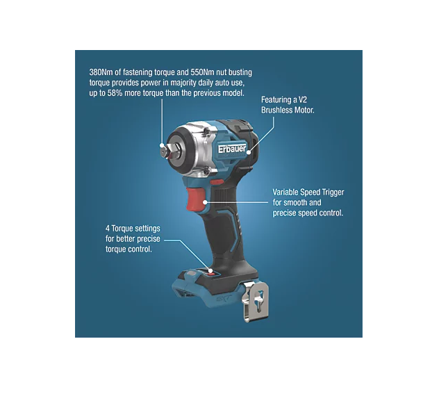 Erbauer ERI1095IPD EXT 18V compact impact wrench featuring V2 brushless motor to deliver 380Nm of fastening torque and 450Nm of nut-busting torque. Provides up to 58% more power than the previous model, whilst also being more compact for easy manoeuvrability in tight spaces such as engine bays and hard-to-reach areas. Ideal for automotive professionals and DIY enthusiasts tackiling stubborn bolts or nuts. 4 torque settings provide precise control for various applications, allowing power to be adjusted to prevent over-tightening. Durable metal gearbox withstands heavy-duty use, whilst the variable speed trigger ensures smooth operation and optimal control. Integrated LED worklight for working in dim or low-light environments with ease. Includes belt clip.