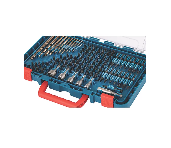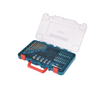 11 x M35 drill bits (1.5, 2, 2.5, 3, 2 x 3.5, 4, 5, 6, 6.5, and 8mm), 76 x 25mm Torsion screwdriver bits (3 x PH0, 3 x PH1, 6 x PH2, 4 x PH3, 3 x SL3, 3 x SL4, 4 x SL5, 4 x SL6, 1 x SL7, 3 x SQ0, 8 x SQ1, 6 x SQ2, 6 x SQ3, 2 x T10, 2 x T15, 2 x T20, 2 x T25, 1 x T27, 1 x T30, 2 x PZ0, 2 x PZ1, 6 x PZ2, 2 x PZ3), 6 x Hex (metric): (2, 2.5, 3, 4, 5 and 6mm), 6 x Hex (imperial): (5/64", 3/32", 1/8", 5/32", 3/16", 1/4"), 15 x 50mm Torsion screwdriver bits: (PH1, PH2, PH3, PZ1, PZ2, PZ3, SQ0, SQ1, SQ2, SQ3, SL3, SL4, SL5, SL6 and SL7), 5 x Nutdriver: (6, 8, 10, 11 and 13mm) and magnetic bit holder.