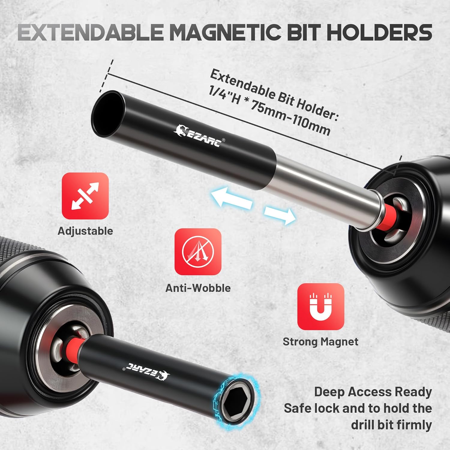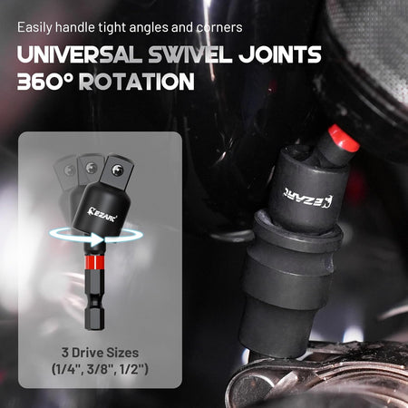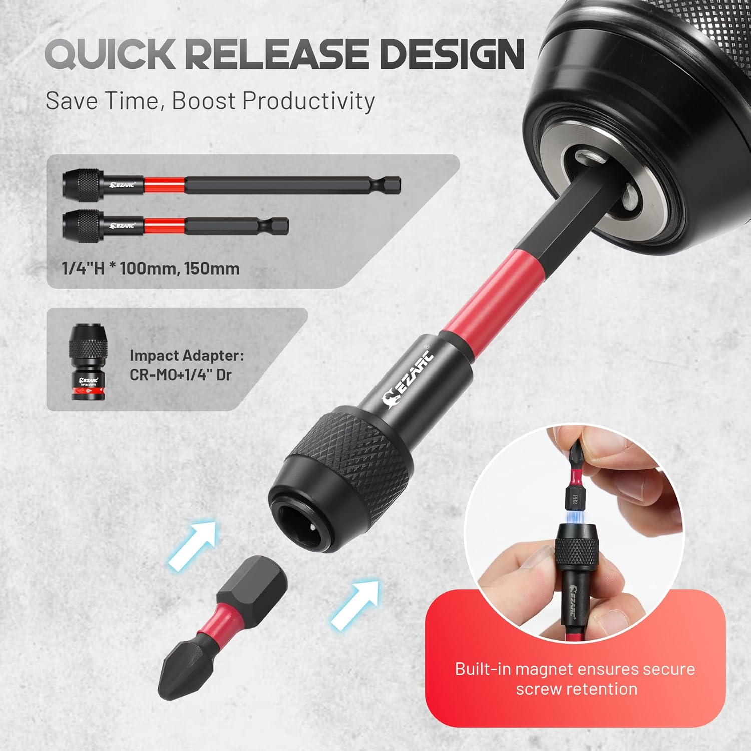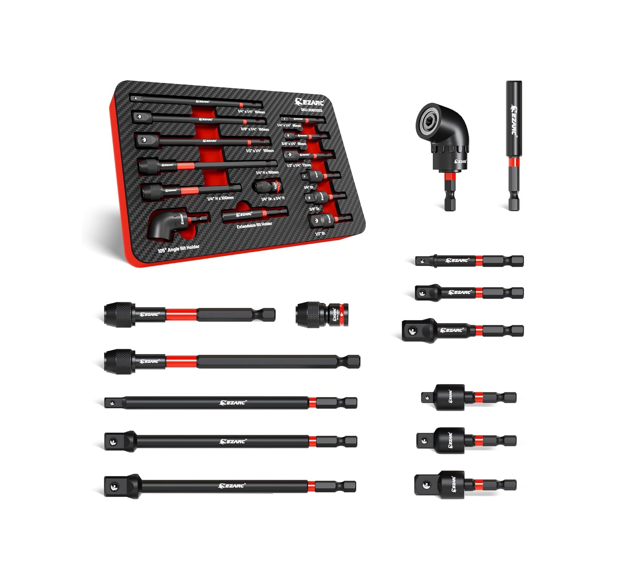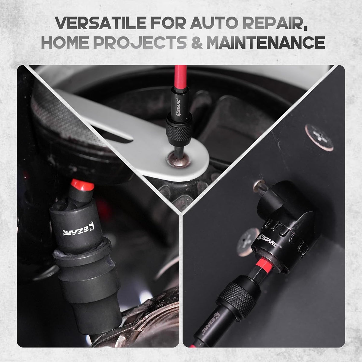 • 【Complete Adapter Kit】:The EZARC impact socket set includes: 2pcs quick-release drill extension bit holder (100mm & 150mm), 6pcs socket adapters (1/4", 3/8", 1/2" × 65–150mm), 3pcs 360° swivel joints, 1pc 105° right angle drill, 1pc CR-MO impact socket, and 1pc telescopic magnetic bit holder. A all-in-one impact driver socket set and drill socket adapter solution.