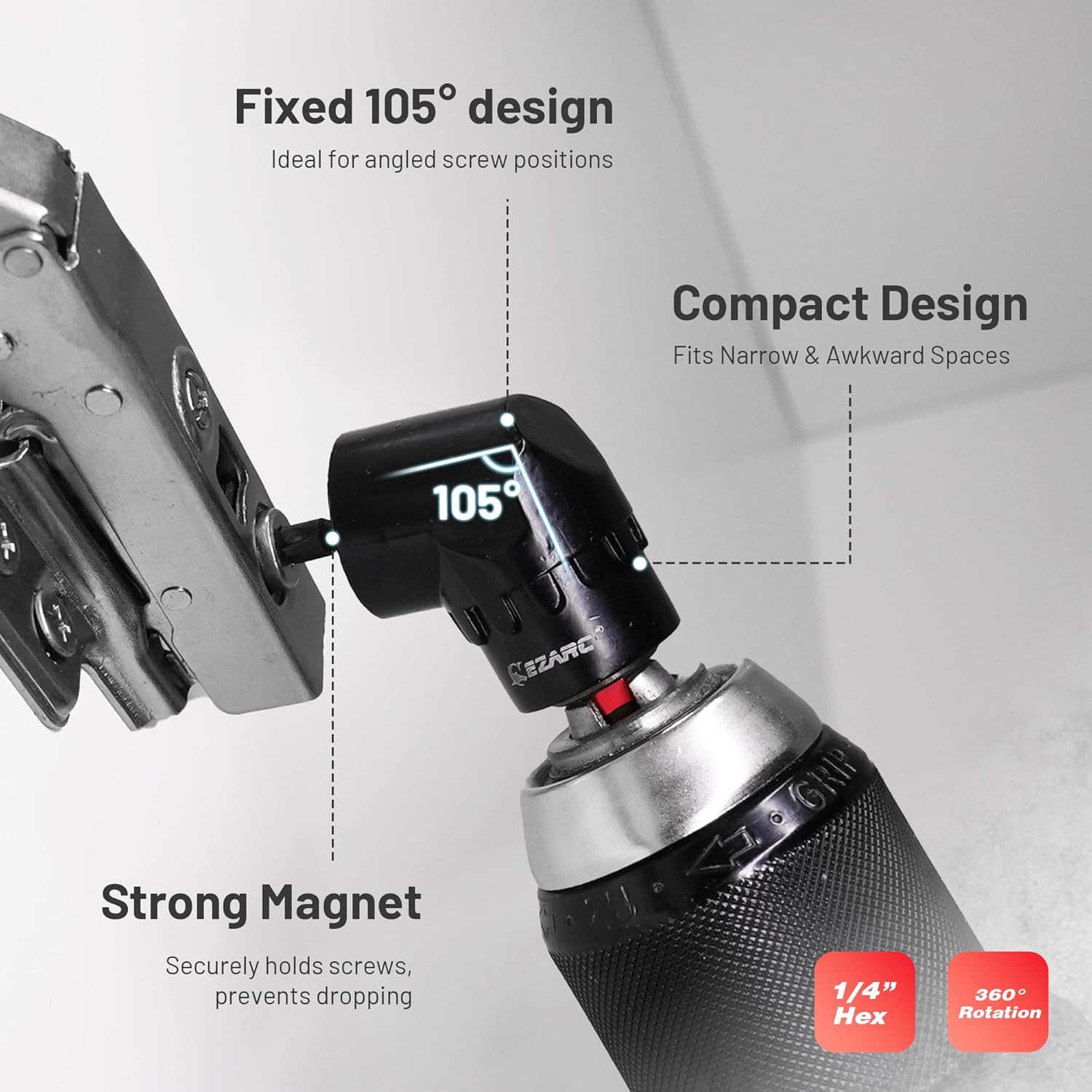 • 【Swivel & Angle Attachments】:3pcs universal joints rotate 360° for smooth, flexible driving at offset angles. The 105° angle driver provides easy access in tight, vertical, or obstructed spaces—ideal for auto repair, cabinetry, furniture, and corner fastening jobs.
