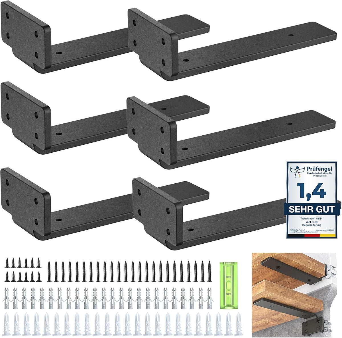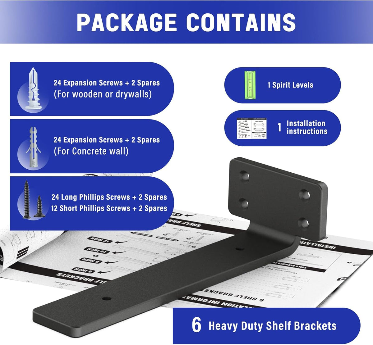 • EASY TO INSTALL: Included are 6 black L-shaped brackets, 24 long screws for wall, 12 short screws for wood planks, 12 brick concrete anchors, which fit very nice and sturdy to keep your floating shelf brackets intact to complete the job to perfection (shelf not included).