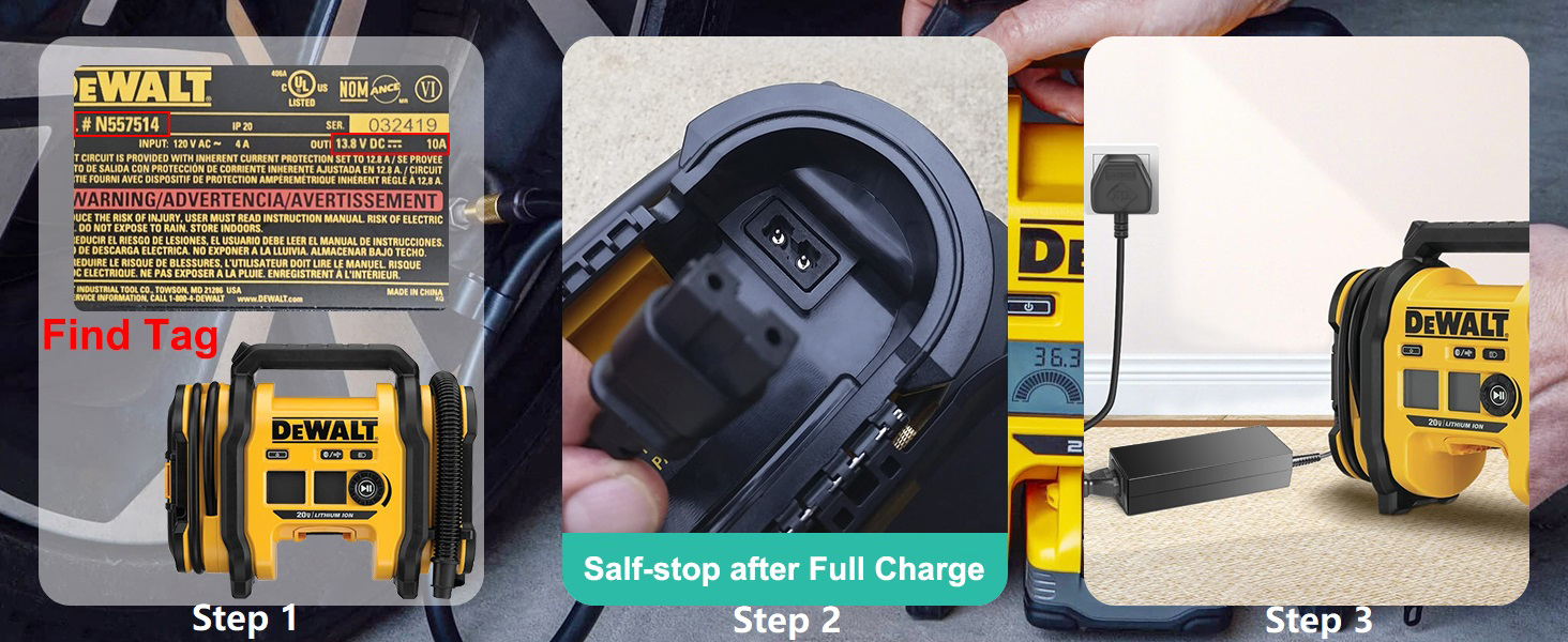 - 13.8V Power Adapter Charger N557514 for DeWalt DCC020IB Inflator Power Supply. Replacement for DeWalt 20V Inflator Cordless Tire Inflator Air Compressor Charger, N557514 Charger & N506585 Inflator Cord for DeWalt 20V MAX Cordless Tire Inflator,compatible with Dewalt DCC020IB 20V max inflator bare, type 1 and 2 as well as DCC020IB-CA type 1