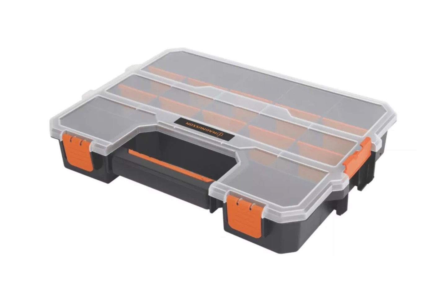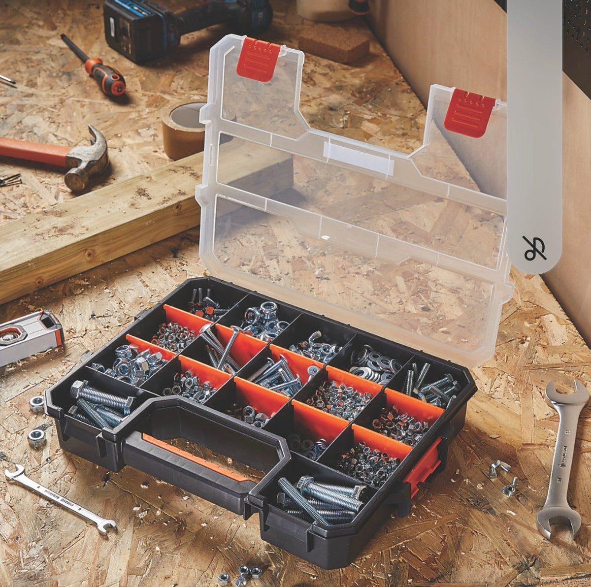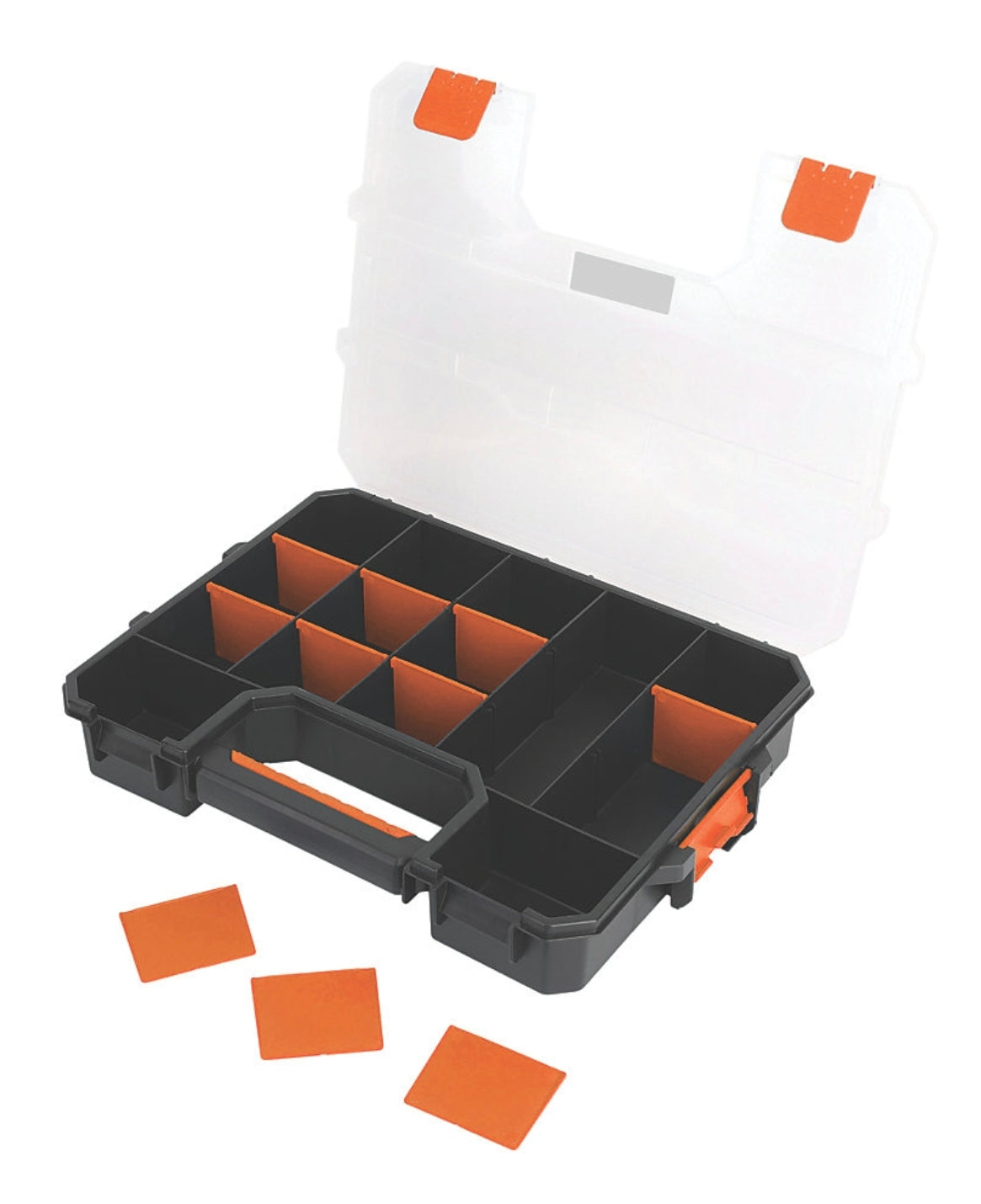 Water-resistant, polypropylene organiser case with 17 compartments and removable inserts. A self-contained system with hinged plastic lid and carry handle.