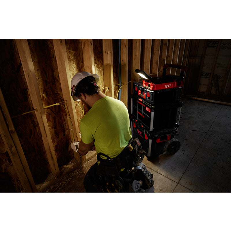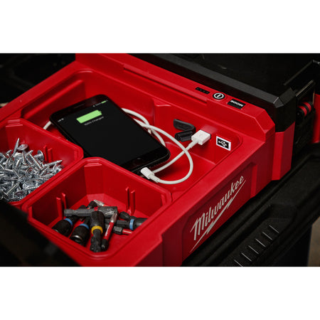 1400 Lumens of TRUEVIEW™ high definition output. IP54: water and dust resistant. 3 modes to manage output and run time. 300° of horizontal rotation and 180° of vertical rotation for complete light head adjustability. Storage compartment for devices and small items. Full system compatibility with the PACKOUT™ Modular Storage System - lighting on and off the stack (top-stack only). Built in charger function for quick and convenient charging of electric devices via the 2.1 AMP USB Type-C and Type-A output port. Low battery indicator, light flashes when battery pack is low on charge. Flexible battery system: works with all MILWAUKEE® M12™ batteries.