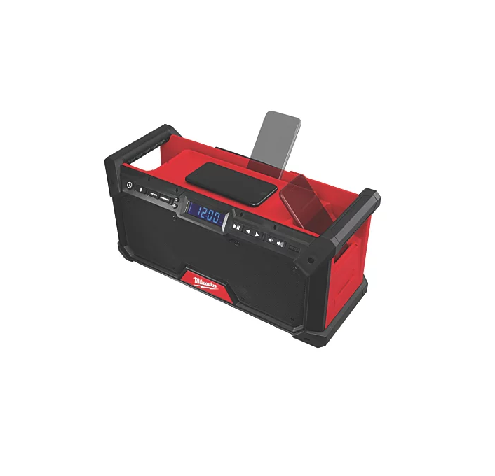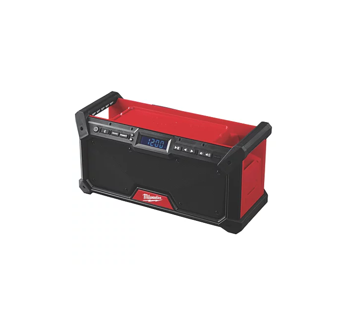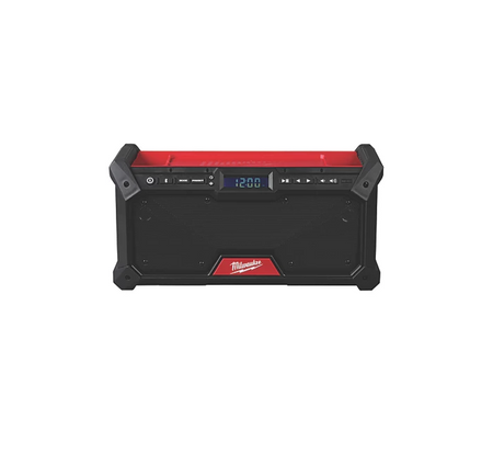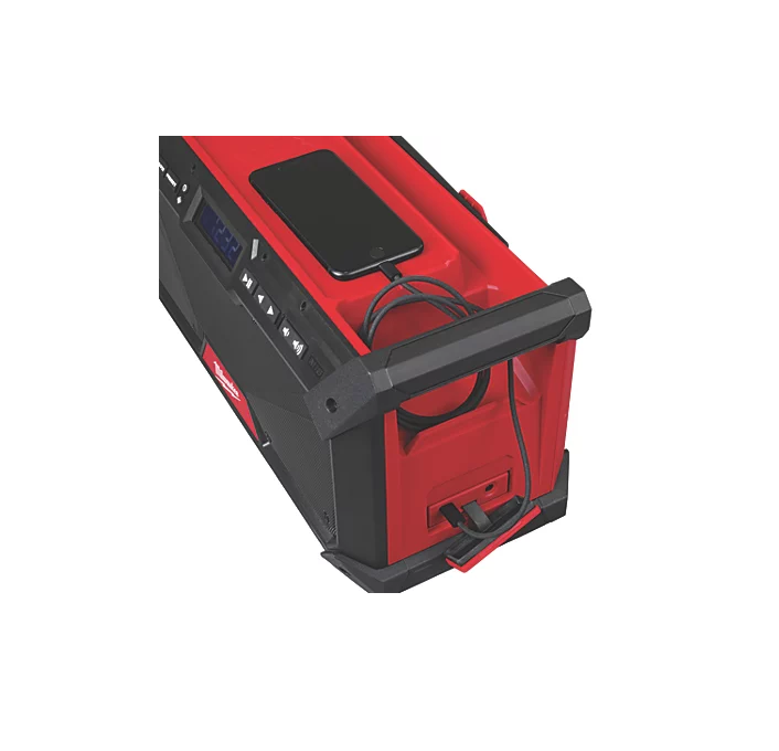High performance Milwaukee M18 jobsite audio system features a DAB+/FM tuner with digital processor to deliver high reception accuracy and signal clarity. Includes a digital Bluetooth receiver, playing music up to 36m away from smartphone, computer or tablet. Dual 8.9cm woofers provide clear, balanced sound, further enhanced by a customisable equalizer. Jobsite radio includes 18 DAB+ station presets, integrated handles for easy transport, and onboard storage for phones. Shock absorbing end caps and metal speaker grills protect from drops, water and debris on the jobsite. Protected USB-C power outlet for device charging in both AC and DC modes. Flexible battery system compatible with all M18 batteries. Provides up to 13 hours of run time when used with M18B5 Redlithium 5.0Ah battery (sold separately).