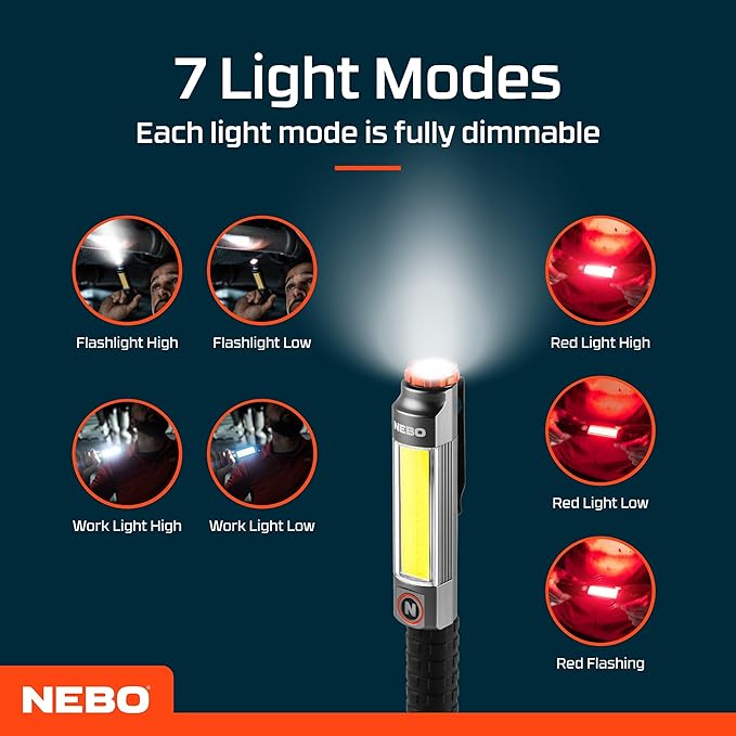 Bright torch and worklight for optimal illumination in various situations, with a maximum beam distance of 82m. Features red strobe light as well as low and high flashlight, worklight, and red light modes. COB work light generates 600 lumens, while top light emits 220 lumens. Red COB light for distress signalling and roadside emergencies. Comes with a steel pocket clip and a powerful magnetic base for a convenient hands-free lighting solution. Includes dimming, push-button switch and power memory recall functions.