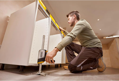 Versatile handheld tool for lifting, levelling, holding and spreading of heavy or awkward objects such as appliances, sheet materials or furniture. Engineered for safety, this professional, heavy-duty tool enables easy hands-free lifting up to 150kg to a maximum height of 220mm. Ideal for jobs like hanging doors, installing kitchen cabinets and appliances and fitting windows in all environments, with enclosed metal-plate housing to enhance durability and prevent dust entering the tool. The robust lifting tool can be operated by hand or foot, with an ergonomic overmoulded handle providing extra grip, comfort, and control. Fine adjuster lowers the load by up to 2.5mm per toggle for precision levelling and spacing, with a full release button safely recessed to avoid accidental activation. Large base plate, with angled edge, slides easily under low objects and reduces the risk of tipping, with 4 x screwholes countersunk into the base to anchor the lift for maximum stability.
