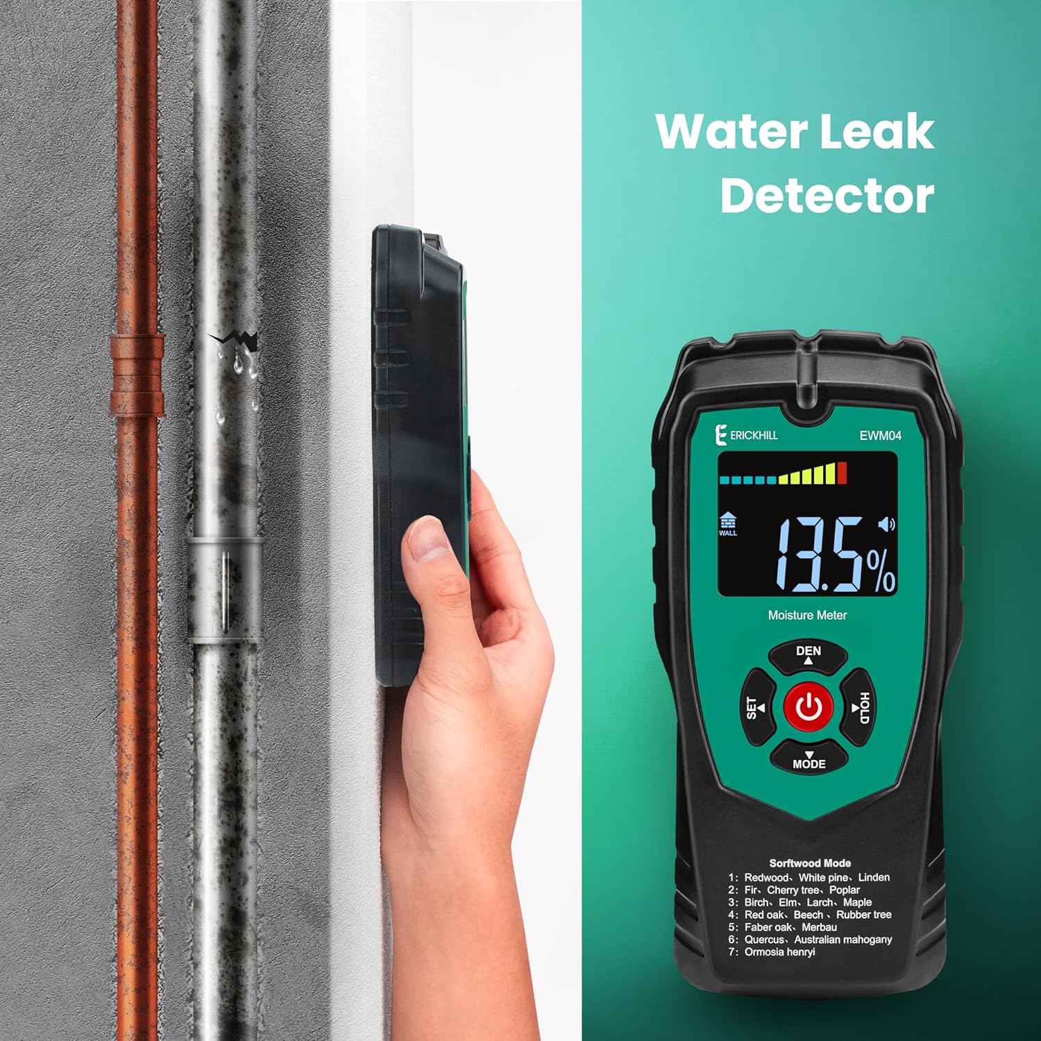 • Non-Invasive: ERICKHILL Moisture Meter adapts non-invasive and inductive method to measure moisture. Simply scanning through the material for moisture level! No more hard works and damage to the material!